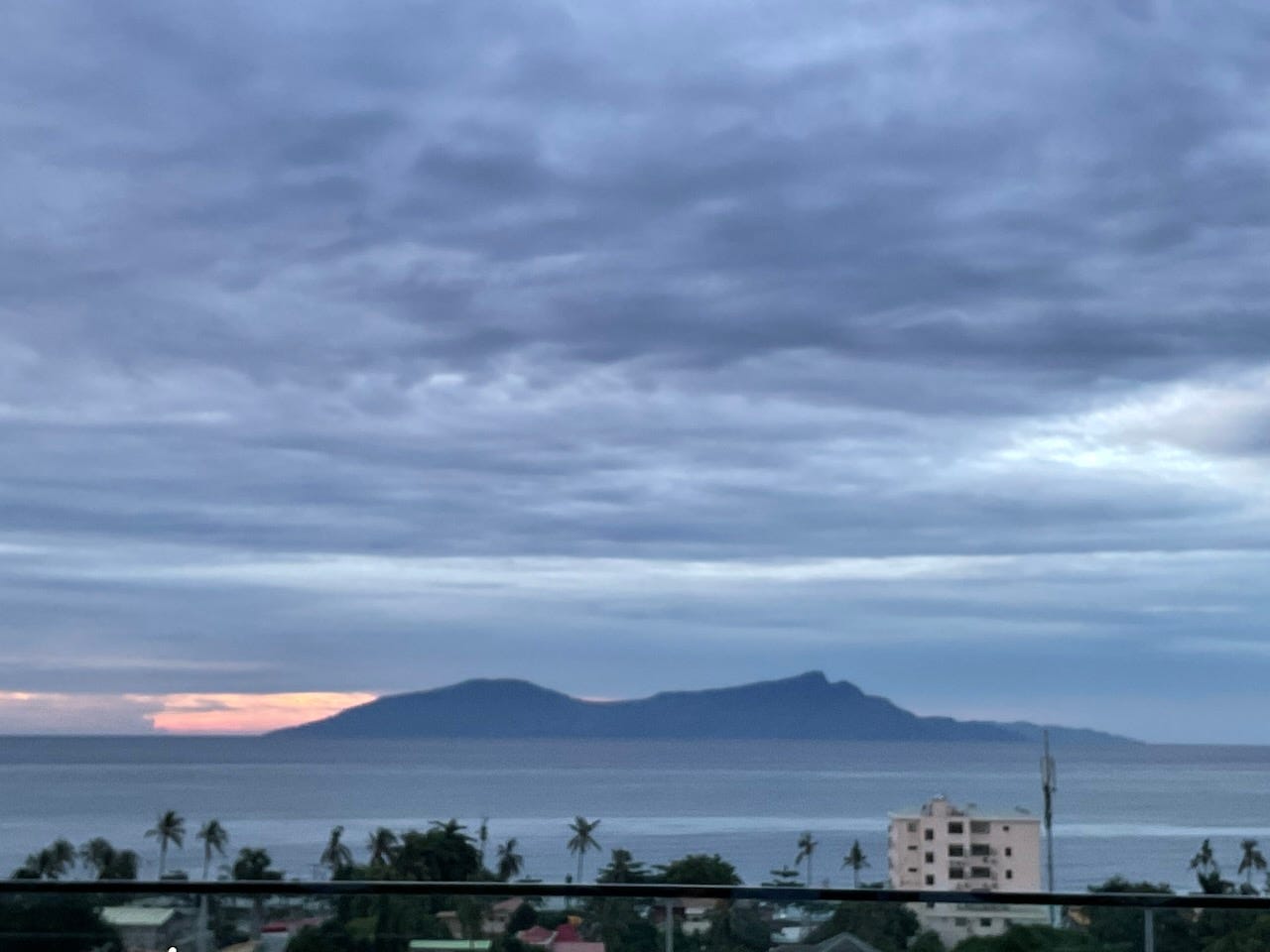 As I look outwards, over my screen, the sea is a deep, deep blue, increasing in vibrancy in clearly-distinguished bands indicating sudden drops in the sea floor. On the horizon, uniting ocean and atmosphere, a steep-sided, twin-peaked island. Its green wooded slopes are illuminated by the sunset, revealing itself through the shrinking clouds. Columns of mist rise as the sun's heat falls on the recent rainfall.